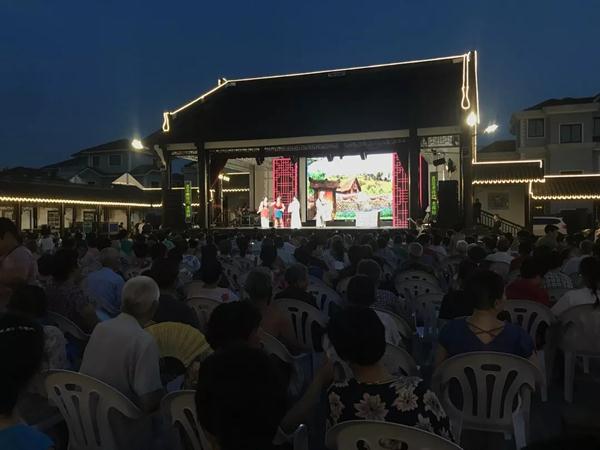 在绍兴镜湖新区,大树江畔,有一个闹中取静的城中新村,大树港。月光洒在波光淋漓的河面,临河就是一座有水乡特色的戏台,7月27日晚,浙江省民营文艺表演团体折子戏精品展演最后一场在这里上演,吸引了附近灵芝、东浦、袍江等地戏迷前来观看。