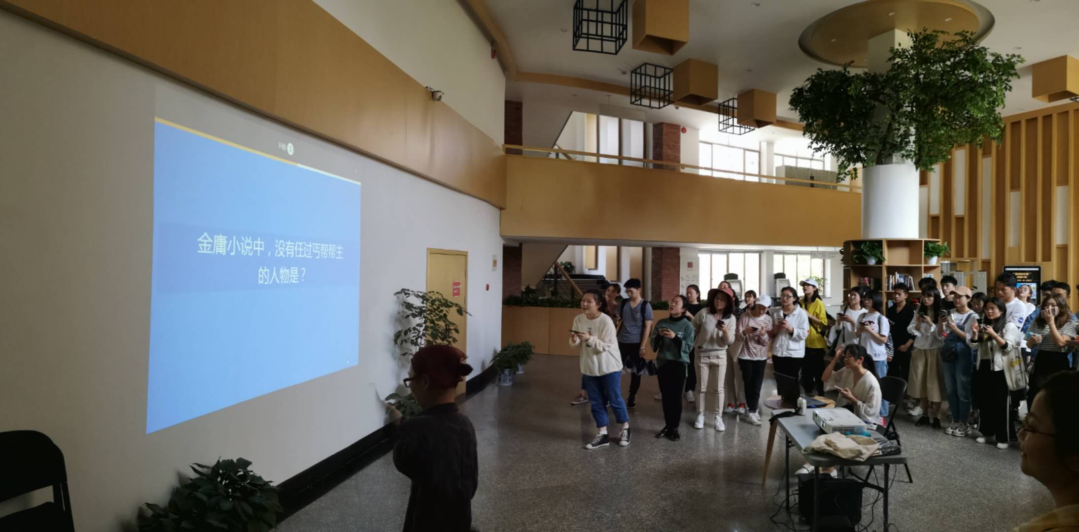 图书馆副主任(主持工作)项骏表示,“头脑王者”百科知识互动竞答活动是为校第十届“读书月”策划的创新型活动 ,这是在信息化时代背景下,首次举办的面向全校师生的百科、诗词等现场线上知识互动竞答活动。参赛师生在现场用手机微信扫描投影上的当场赛次二维码,输入名字即可参与答题。