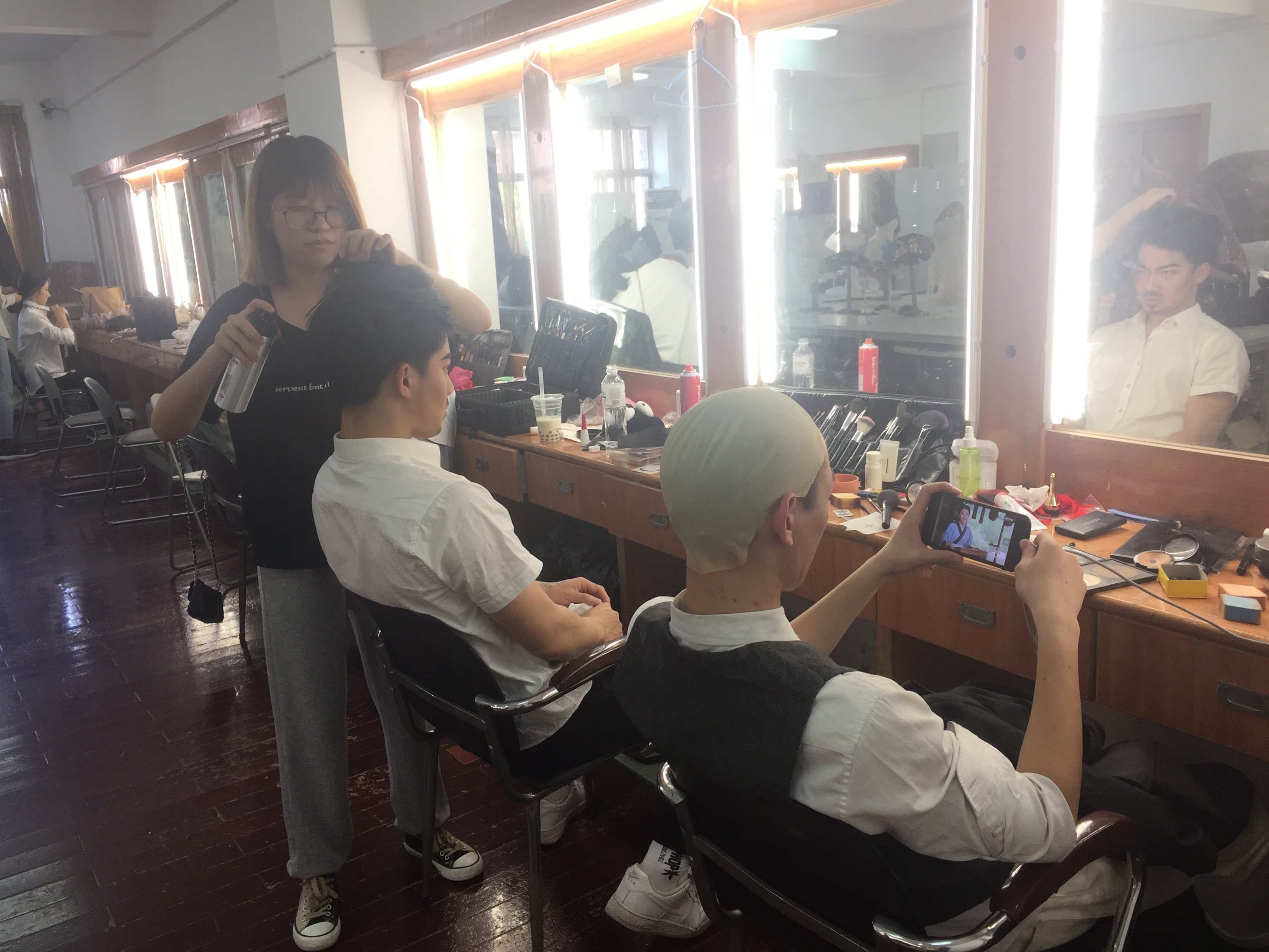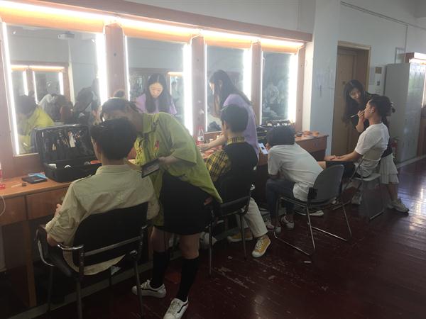彩排阶段,负责化妆的同学也加入了进来,从一开始的试妆、改妆、再修改到最后的定妆,同学们要考虑许多专业问题,有人物故事背景,人物的性格,还有人物的情感经历等。只有深入理解人物才能更好塑造人物,用外部形象的塑造给演员的表演加分。