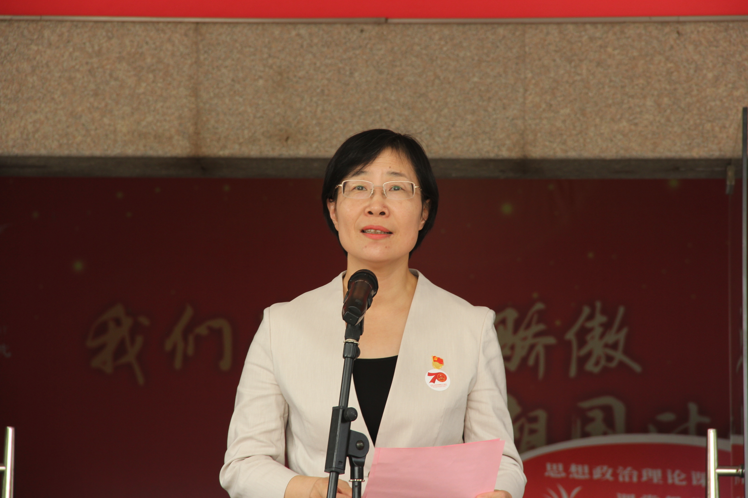 社会科学部副主任(主持工作)刘秀峰主持开幕式。她介绍了社会科学部自去年成立以来,在学校党委的关心支持下,各项工作有序开展,一年来,以问题为导向,聚焦课堂,通过邀请名师开展示范课、青年教师教学诊断、信息化教学培训、科研项目培育等途径,积极探索让“课堂活起来,学生动起来”的教学模式,在提升课堂教学质量、教学科研水平和师资队伍建设等方面取得初步成效。刘秀峰表示,本次展览是思政教师向全校师生的一次阶段性教学汇报,是一次爱国教育实践活动,也是对中华人民共和国成立70华诞的祝福。展览的作品不仅有结合专业特点的学生书画、海报等静态作业,也有微电影、多媒体课件等动态视频,还有教师精彩一课。社会科学部期待通过这样的活动激发教师创新课堂的积极性,增强理论学习的自觉性,提高学生学习的主动性,满足学生的获得感。也希望借助这样的活动推动思政理论课建设和学生日常思想政治教育深度融合,助力培养德艺双馨的社会主义文艺事业建设者和接班人。