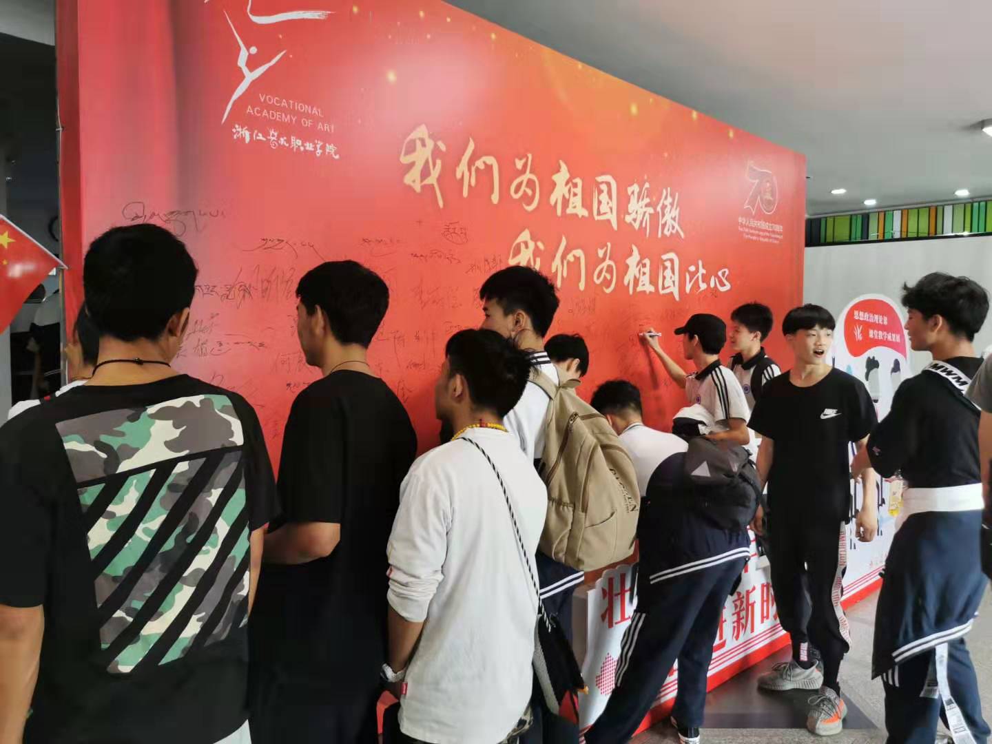 本次成果展是学校向新中国成立七十周年献礼的系列活动之一,创意独特、设计新颖,得到了许多前来参观的师生的赞赏。热场的快闪《我和我的祖国》表达了学生和祖国永远在一起,一刻不分离的深情厚谊。展厅现场人潮涌动,师生认真看展,积极参与互动答题,纷纷在爱国主题墙上承诺签名并拍照留念,表达对我们伟大祖国的深情祝福。