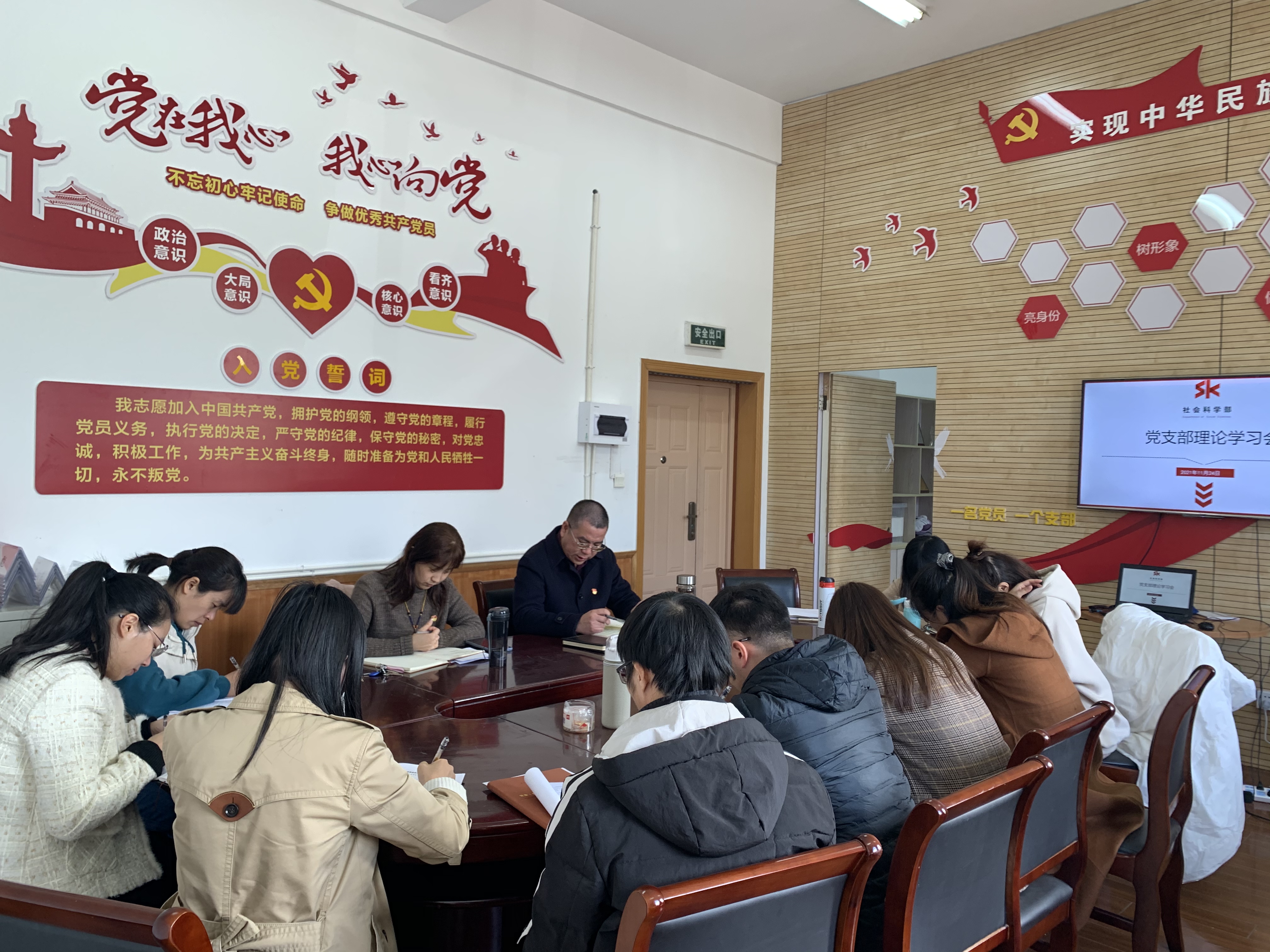 11月24日,直属社会科学部党支部在13102会议室召开支部全体党员理论学习会,就中共中央十九届六中全会会议精神主要内容进行集中学习和研讨。会议由直属社科部党支部书记、副主任陈毅主持。