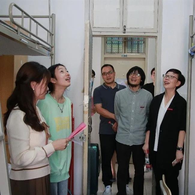 设计学院领导班子来到新生寝室,走访慰问新生入住情况,耐心解答同学们的疑问,鼓励同学们尽快适应校园生活,并为报到当天生日的新生送上了精心准备的生日礼物和蛋糕。