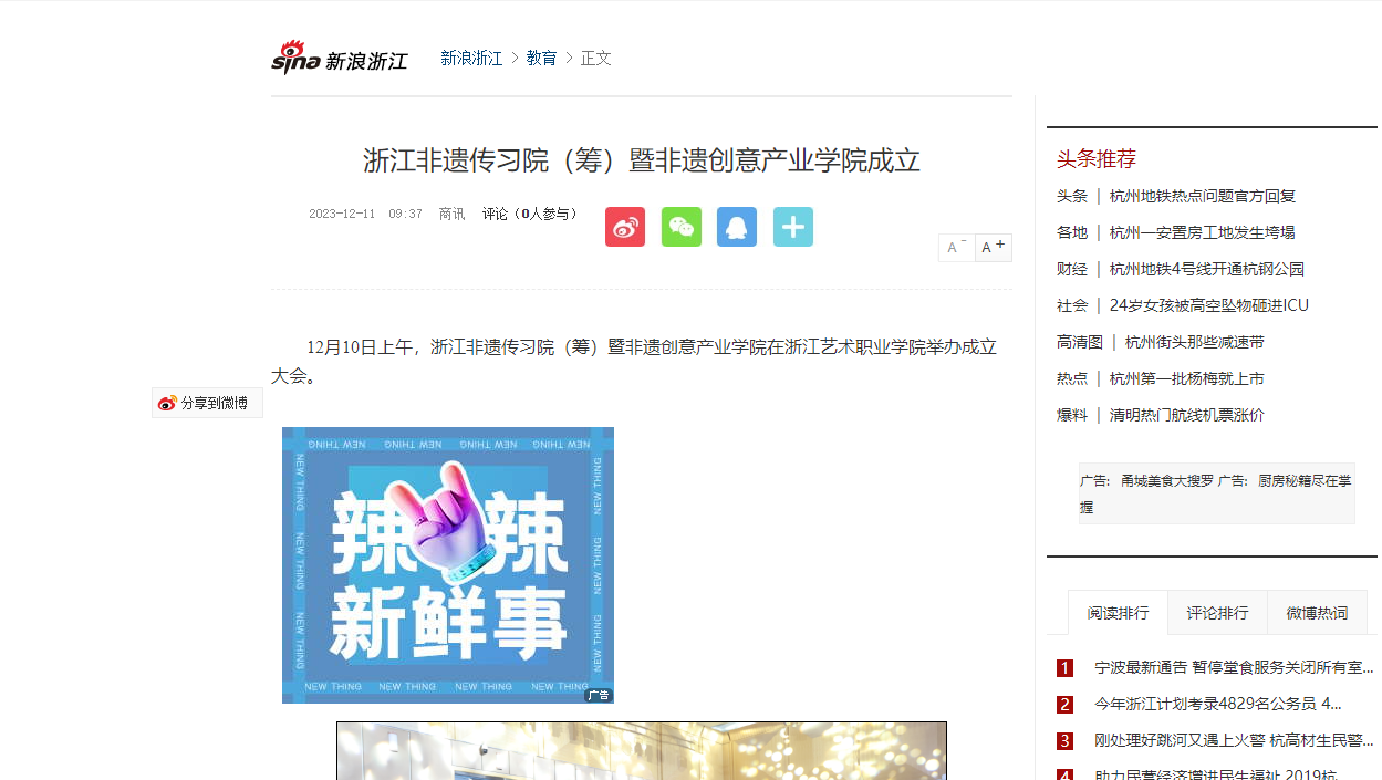 新浪浙江:浙江非遗传习院(筹)暨非遗创意产业学院成立