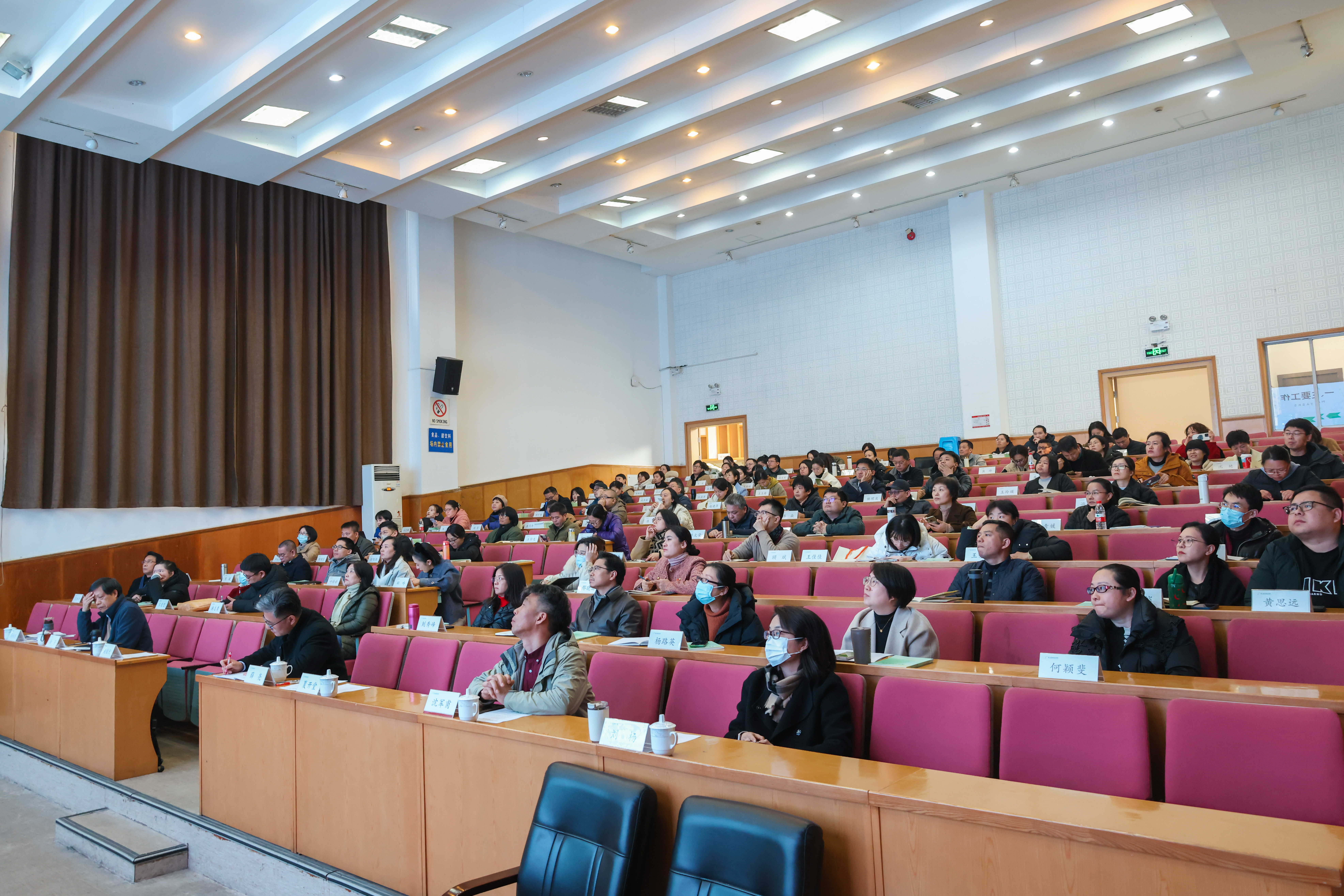 校党委班子成员、全体中层干部、五六级职员、主管岗位人员、基层党支部书记、教研室主任等参加会议。本期初心讲堂还晾晒了全年工作推进情况、揭榜挂帅进展、教科研创数据、发展党员工作、学习强国学习情况、产学合作情况、经费情况、团学活动开展情况等。