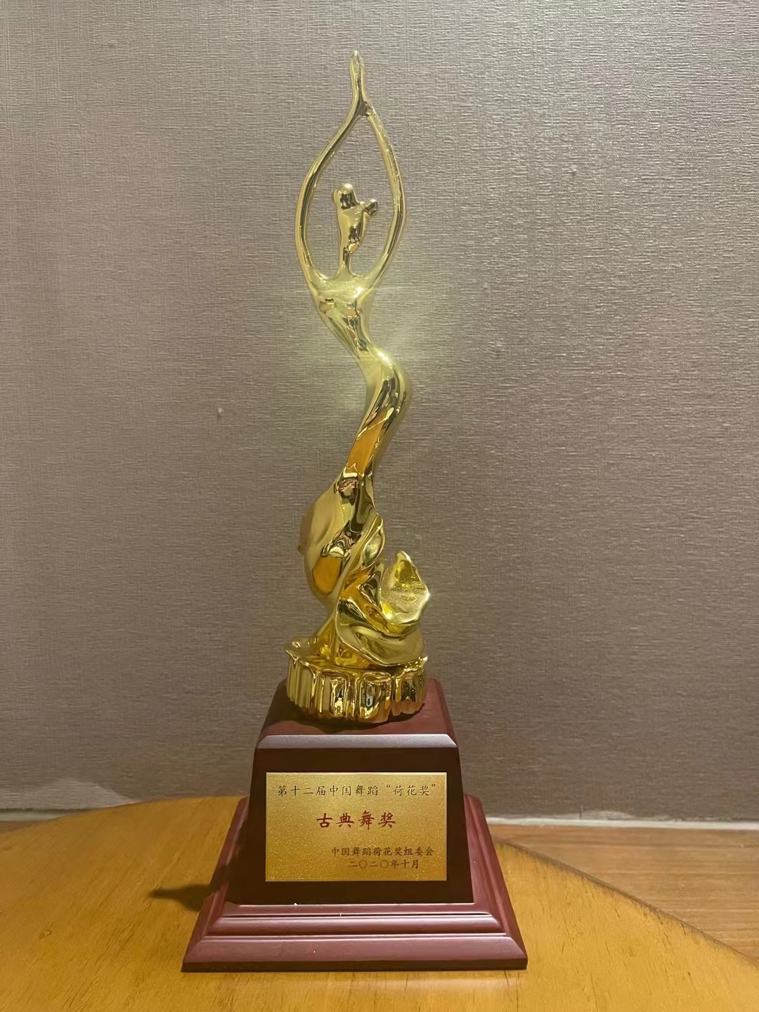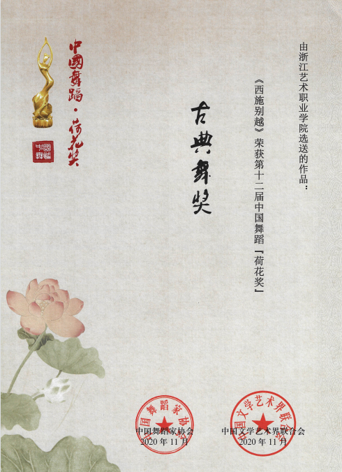 中国舞蹈“荷花奖”由中国文联、中国舞蹈家协会主办,是唯一国家级舞蹈类奖项。第十二届中国舞蹈“荷花奖”古典舞奖评奖终评于2020年10月在河南洛阳举行,全国共有174部作品报名参评,16部作品入围现场终评演出,最终根据现场评分仅评选出3个“古典舞奖”,参赛单位大部分是本科院校和专业院团,竞争激烈。浙艺原创舞蹈《西施别越》取自浙江本土题材,是与中华优秀传统文化相结合的舞蹈作品,由舞蹈学院教师李毅源、杨博文、赵琼林、任承旭等原创编导,在评选中脱颖而出,获得“古典舞奖”。受疫情影响,第十二届中国舞蹈“荷花奖”颁奖典礼一直未能举行。这尊迟到了2年多的奖杯是对《西施别越》和舞蹈学院“双高”建设的肯定。