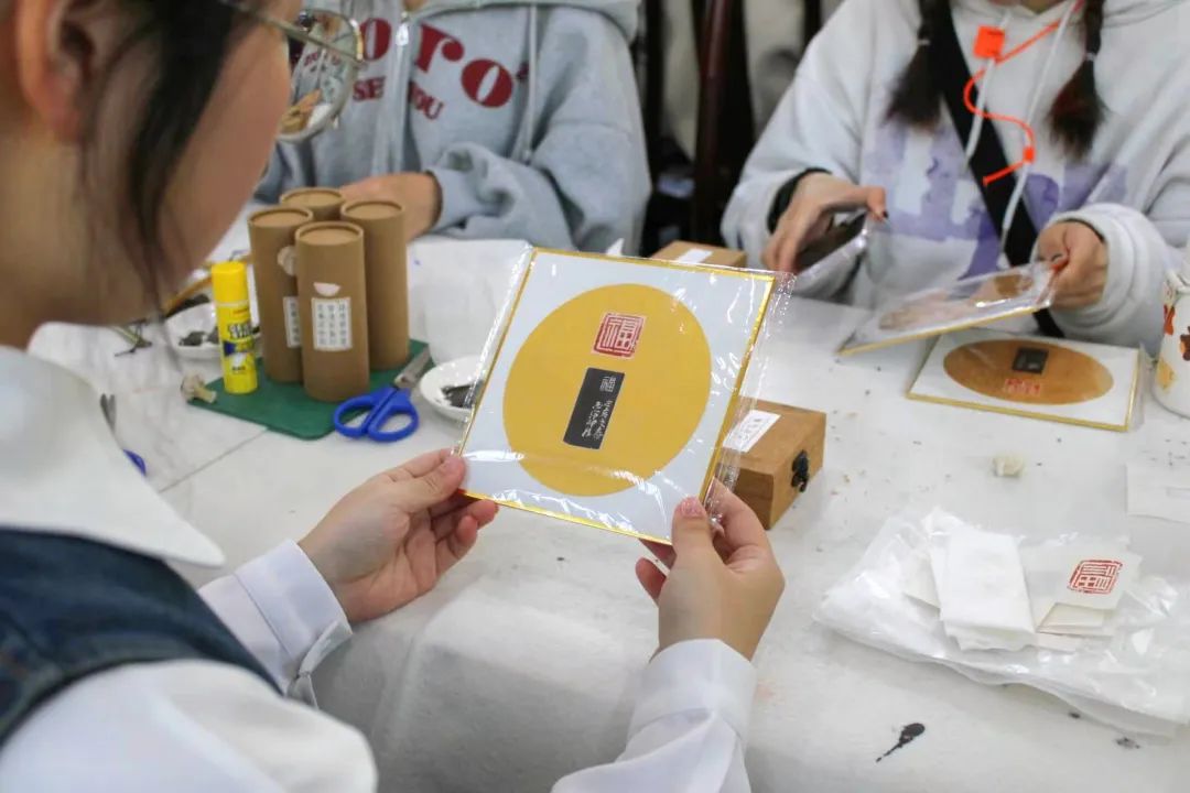 研学中,同学们分别从印章的传拓、钤盖等方面学习上手,并通过覆纸、扫刷、上墨等技法的动手实践,体会到金石篆刻所承载着的丰富艺术形式,也感受到其中所传承着的伟大中华文明。当同学们完成了一幅幅精致的印屏作品时,现场反响热烈,学习氛围浓厚。