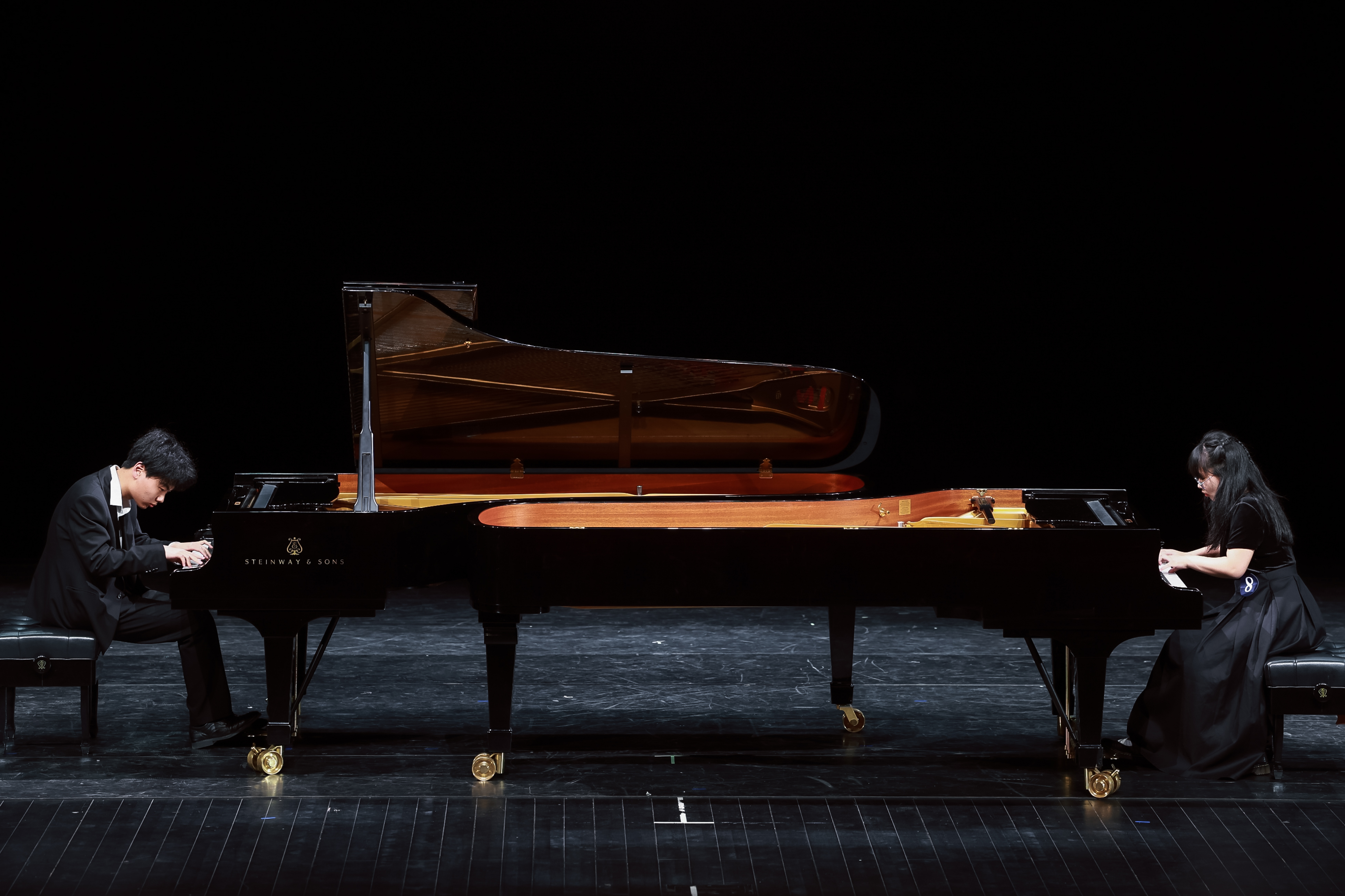 钢琴组自选曲目《骷髅之舞》还原了经典双钢琴演奏,简单古怪的表象下富有想象力;双钢琴演奏的《帕格尼尼主题变奏曲》对技巧要求严苛,除了高难的炫技演奏外,依然有着勃拉姆斯式的伤感情怀;四首联弹《胡桃夹子》主旋律清脆,充满了梦幻而神秘的童话色彩;《军队进行曲》旋律舒畅、优美,调式色彩诙谐有趣,一队一队士兵随之昂扬入场。本次比赛还新设指定作品编配环节,每组选手根据指定的2首经典曲目《小河淌水》和《茉莉花》,进行了富有创意的编配表达,很好的考察了参赛学生的音乐综合能力和艺术表现水平。