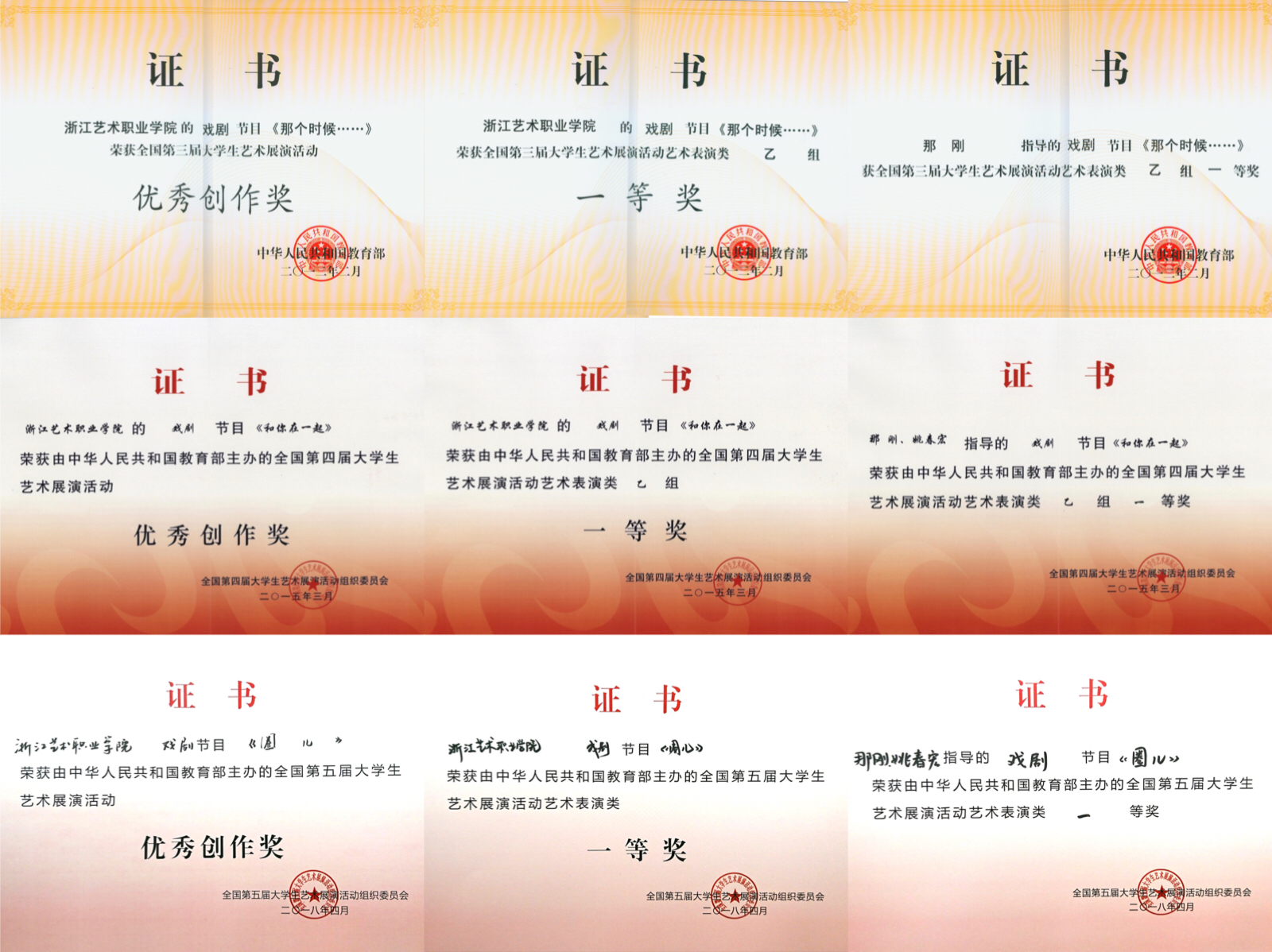 着力培育艺术创新与技术实践兼备、德艺双馨的高素质复合型人才。近年来,学院师生在全国大学生广告创意设计竞赛、全国中华经典诵写讲大赛等国家级、省级各类专业竞赛中累计获奖500余项,连续三届获全国大学生艺术节获一等奖,在浙江省大学生国际创新大赛、“挑战杯”、职业生涯规划大赛中获金奖3项、银奖3项、铜奖10项。构建“课程+”“文化+”“管理+”“服务+”“实践+”五育协同育人体系,累计开展各类校园文化活动500余场,参与师生达2万人次。组建“红色轻骑兵”宣讲团,在校园内外开展巡回宣讲百余场,推动党的创新理论入脑入心。